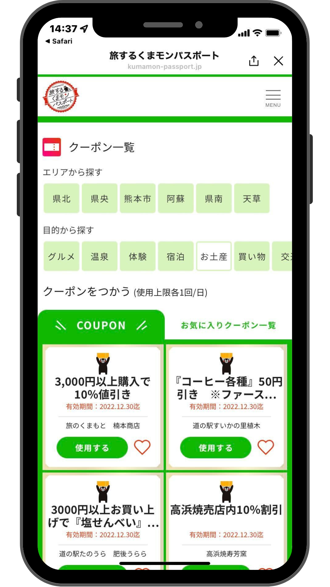 LINE公式アカウント「旅するくまモンパスポート」と友だちになることで、熊本県内の宿泊施設、飲食店やお土産屋さん等、現地で様々な特典を受けられるクーポンブックを利用できます。