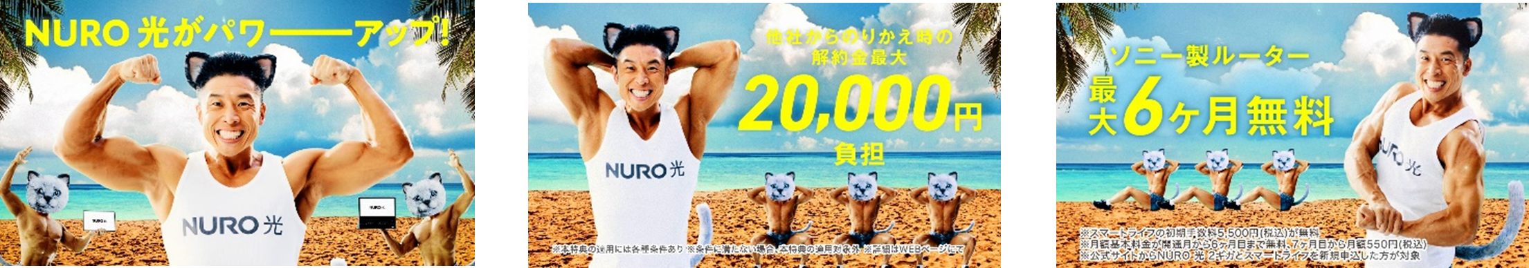 今回さらに、「NURO 光」公式Twitter (@NUROhikari_Sony)において、本WEB-CMと連動する形で、なかやまきんに君の人気ネタ「筋肉ルーレット」、「飴玉キャッチ」を用いたオリジナル動画を視聴しながら賞品が当たるキャンペーンを実施します。 また、期間限定のキャッシュバックキャンペーン中に「NURO 光」に申し込むことで、さらに追加で1万円のキャッシュバックを実施します。