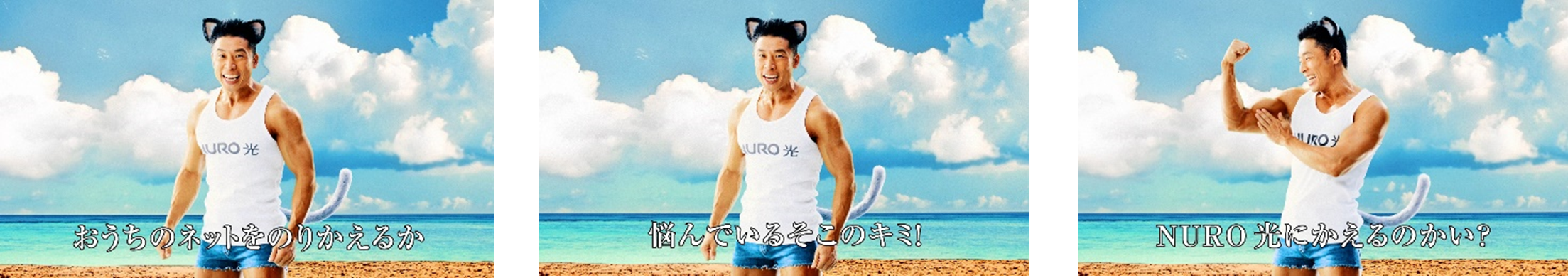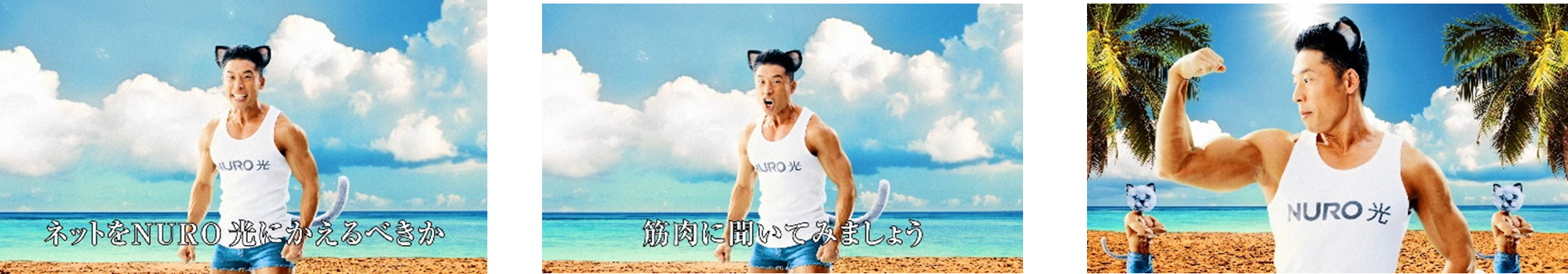 「ピピピピピ」と筋肉に「NURO 光」に乗り換えるべきか否かを問いかける、なかやまきんに君らしい内容に。長めのセリフもほぼノーミスでクリア。筋肉の動きにも注目です。