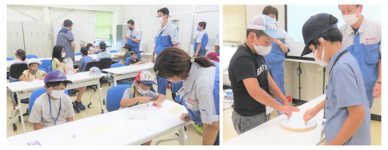 事前に会社が用意したコマを回し、回転する長さを競いました。コマは北上工場の切削加工の工作機械を用いて加工され、レーザー加工機でお子さんそれぞれの名前が印字されています。自分専用のコマによる対戦はとても盛り上がり、また、加工技術の奥深さを知ってもらう機会ともなりました。