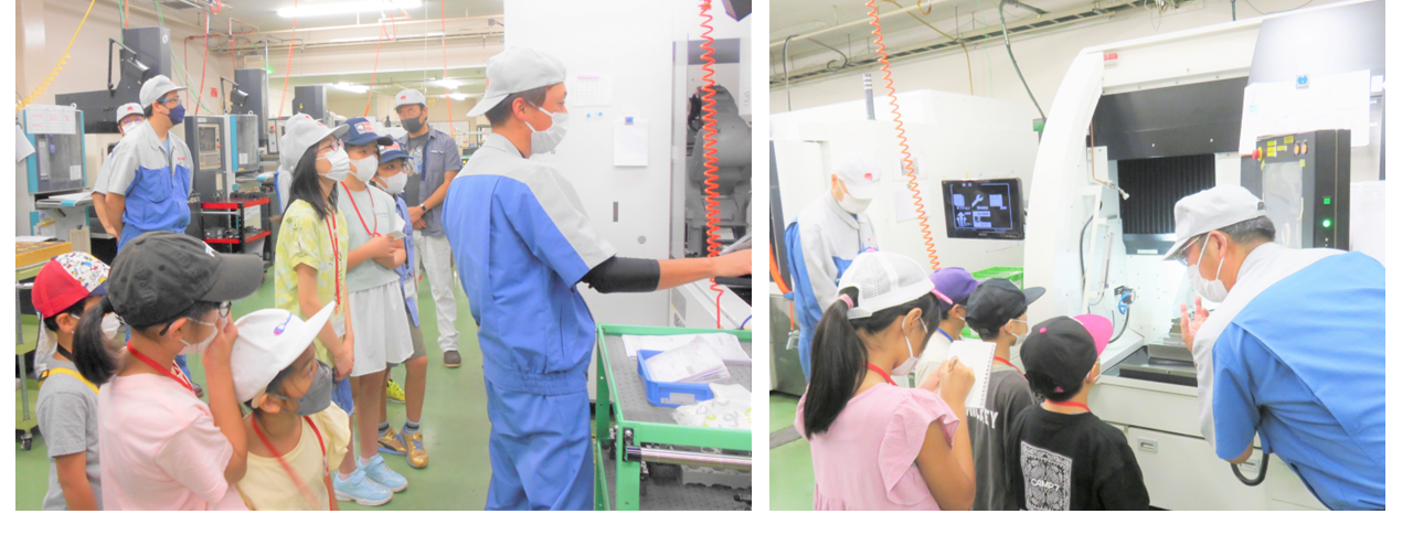 元気よく挨拶しながら、様々な工作機械を見学しました。お父さん・お母さんの部署も見学し、どのような仕事をしているかを真剣に聞いていました。