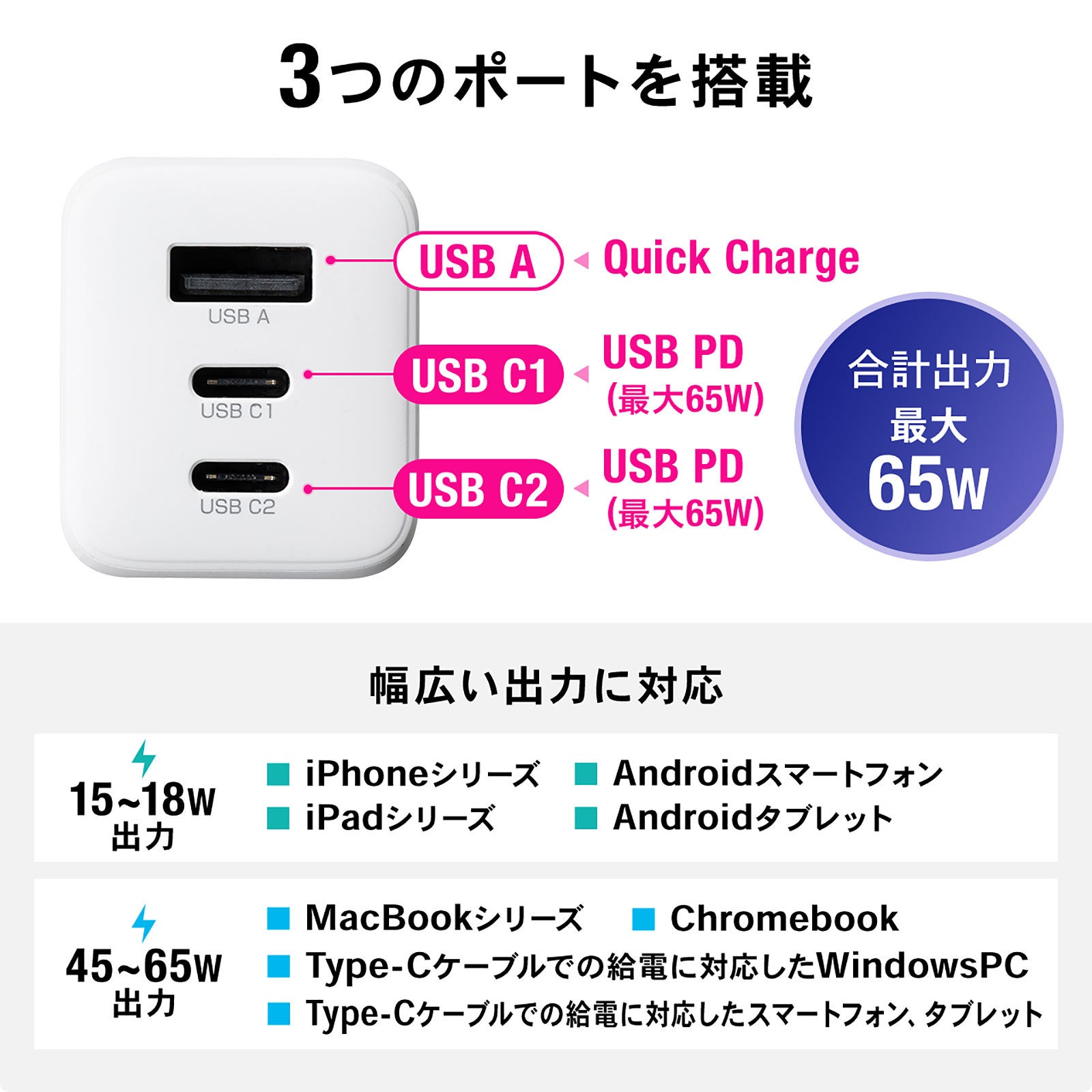 本製品は、最大65WまでのUSB PD規格による充電に対応したUSB充電器です。