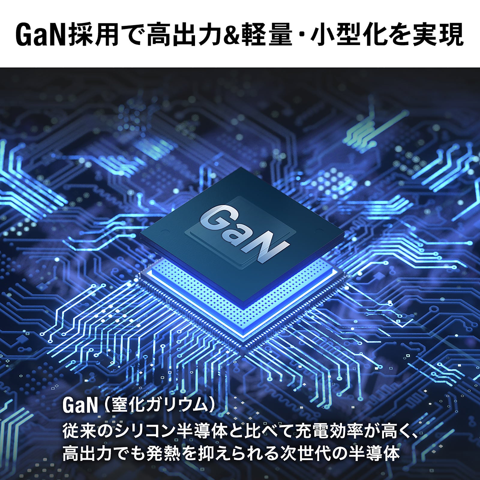 次世代半導体のGaN(窒化ガリウム)を採用し、高出力でありながら発熱を抑えたコンパクトサイズです。