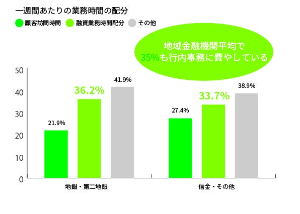 法人営業担当者のうち、地銀・第二地銀は36.2%、信金・その他は33.7%の時間を、顧客に対する訪問活動よりも融資事務の処理に使っていました。地域金融機関全体の平均で35%も行内事務に費やしていることになります。