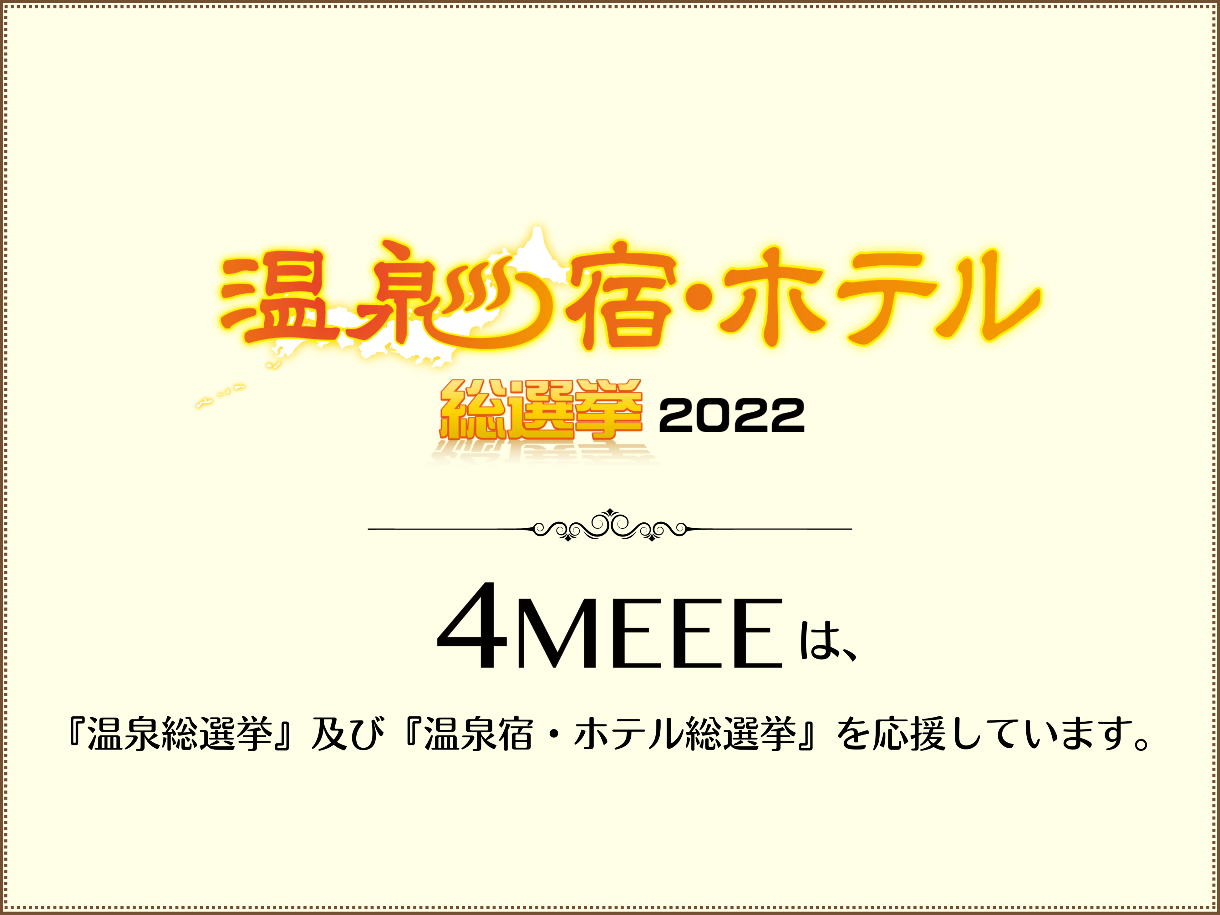 この度、4MEEE株式会社(所在地:東京都新宿区、代表取締役:尾久一也)の運営する女性向けWEBメディア『4MEEE(フォーミー)』(https://4meee.com/)は、「旅して日本プロジェクト(運営事務局:株式会社ジャパンデザイン、本社:東京都渋谷区、温泉総選挙総合プロデューサー/代表取締役/社会起業家:山下 太郎)」が主催する『温泉総選挙2022』および『温泉宿・ホテル総選挙2022』の応援メディアとなり、連携企画を実施することとなりました。