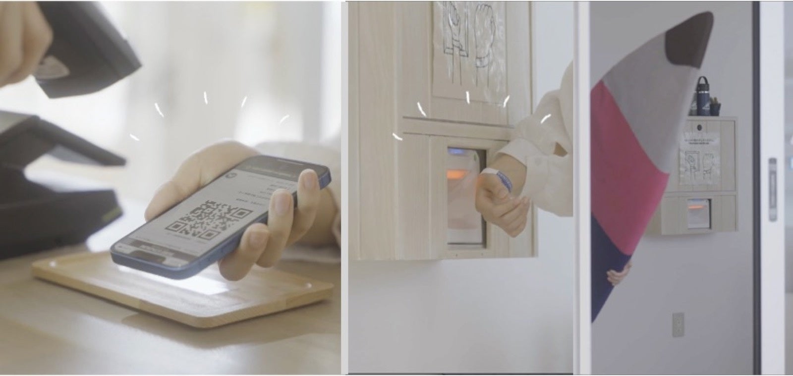 Web サイトから予約すると、施設利用のための QR コードが生成され、利用者は当日受け取る QR コード付きのリストバンド 1 つで館内を利用できます。リストバンドは Claris FileMaker を介して、入退出管理サービス「Akerun」とも連動しており、ロッカーや入退場用のドアの開閉管理も行うことができます。受付用の端末にリストバンドの QR コードを読み取らせるだけでスムーズに入退場ができるため、スタッフはお客様のチケットを確認する手間がかかりません。また、QR コードは精算にも利用できるため財布や鍵を持ち歩くことなく、快適に過ごすことができます。