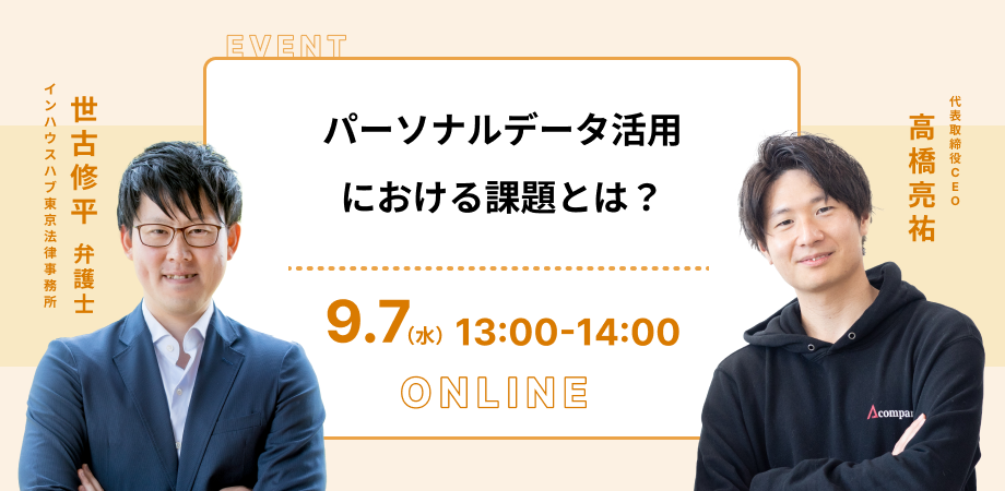 DX(デジタル変革)が加速する中、パーソナルデータ活用のニーズが高まっています。一方で、パーソナルデータ活用を推進していく上では、法律やレピュテーションなど多様な課題と向き合っていく必要があります。 そこで今回は、アドバイザーとして参画いただいたインハウスハブ東京法律事務所弁護士の世古修平氏にご登壇いただき、パーソナルデータ活用を進める上での課題について、実際の事例を踏まえてお話しいただきます。また後半セッションでは、Acompany代表取締役CEOの高橋亮祐が登壇し、トークセッションを開催します。ぜひご参加ください。