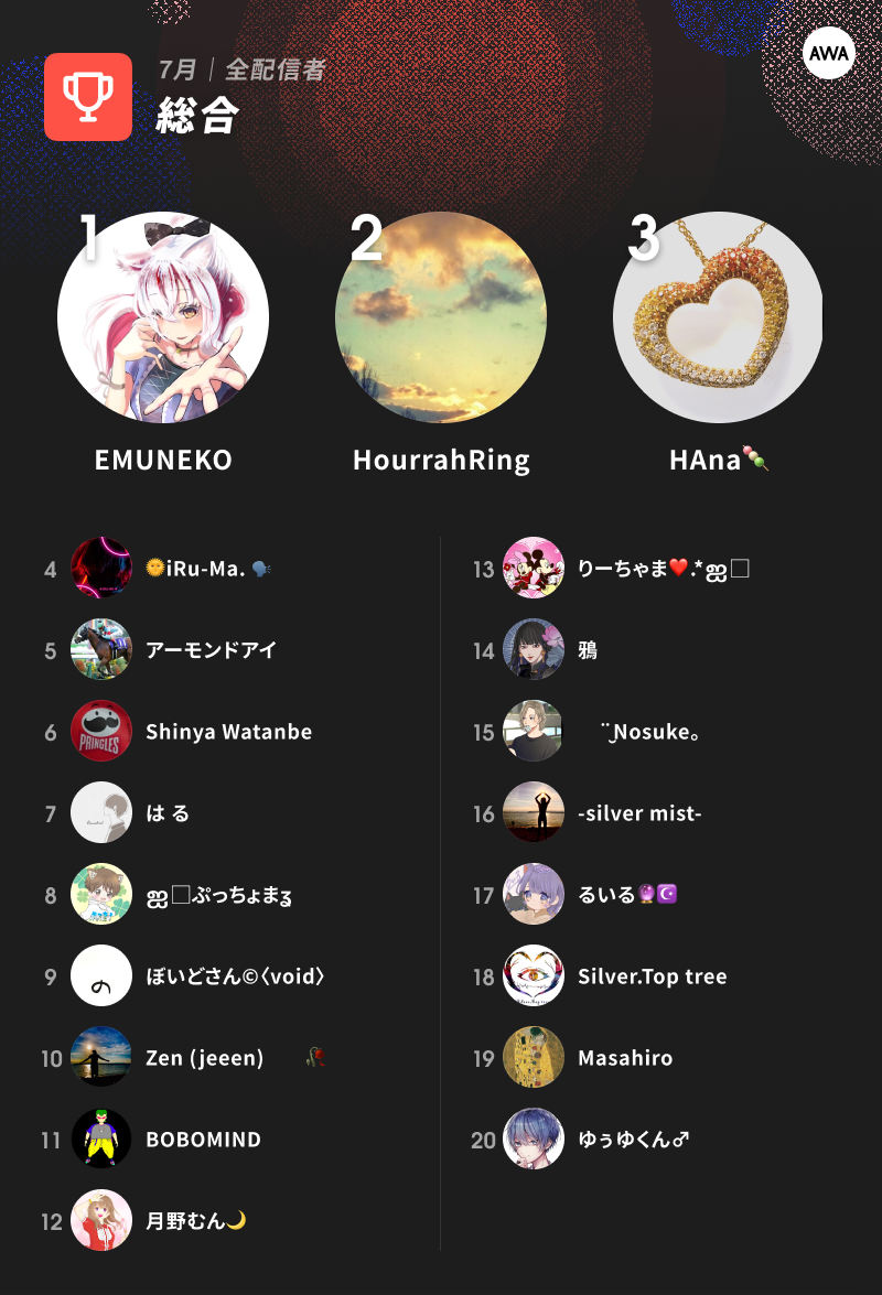 2022年7月度のラジオ配信ラウンジランキングで総合1位に輝いたのは、視聴数、フラワーチャット数、開催回数の3項目すべてで3位以内に入った「EMUNEKO」。2位には、視聴数で1位を獲得した一般配信者の「HourrahRing」が、総合2位にランクインしました。3位には、視聴数で2位を獲得した「HAna」が見事3位入賞を果たしています。その他にも、Shinya Watanbe、アーモンドアイ、Silver.Top treeなど一般配信者も上位入賞を果たしており、鴉、BOBOMINDなど、7月初回開催の配信者もトップ20に名を連ねています。