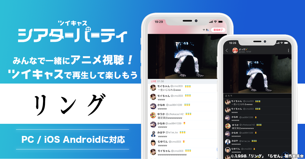 放送時間中にご自身のアカウントでツイキャスVVにログインすることで、お友達と一緒に同じ空間で『リング』『リング2』を視聴することができます。