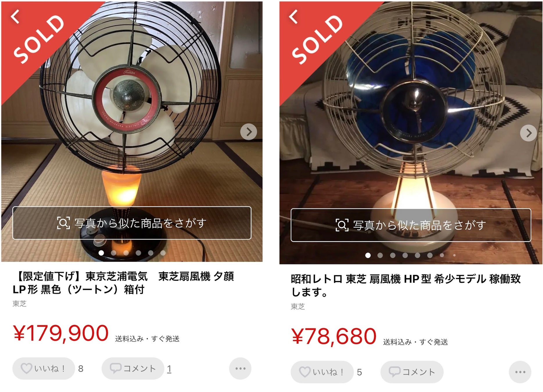 昭和レトロ・扇風機を「メルカリ」上で検索すると、今では売られていない多数の扇風機が出品されています。今では見られないデザイン、2段になっているファンなど、特徴的な商品が多数あり、なかには10万円を超える値段で取引されている扇風機もあります。