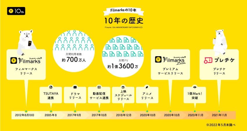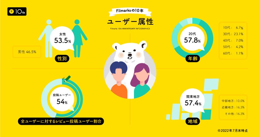 Filmarks(フィルマークス)は現在、都市部に住む20代〜30代の映画やドラマ、アニメファンを中心に、月間で約220万件のMark!(観た)を集め、国内のエンタメレビューアプリにおいてNo.1(※2022年7月時点。レビュー数や検索上位順をベースに算出)を記録しています。この度、Filmarksは、2022年8月で10周年を迎えることができました。ユーザーの皆様への感謝を込めて、Filmarksの最新の状況をまとめたインフォグラフィックを公開します。