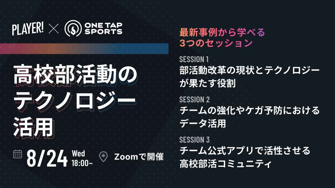 今回のカンファレンスではそのような悩みにこたえるべく、そもそも今部活動にどのような変化が起きているのか、学生がスポーツに取り組む環境をより良いものにするために何が必要なのか、そこでテクノロジーを活用する理由とは何なのかを、実践するチームの事例を交えてご紹介します。視聴者の皆様の明日の活動のアップデートにつなげることを目的に、スポーツチームのコンディション管理ソフト「ONE TAP SPORTS」と、チーム公式アプリを起点に収益化を支援する「Player! WHITE」が共同で企画いたしました。