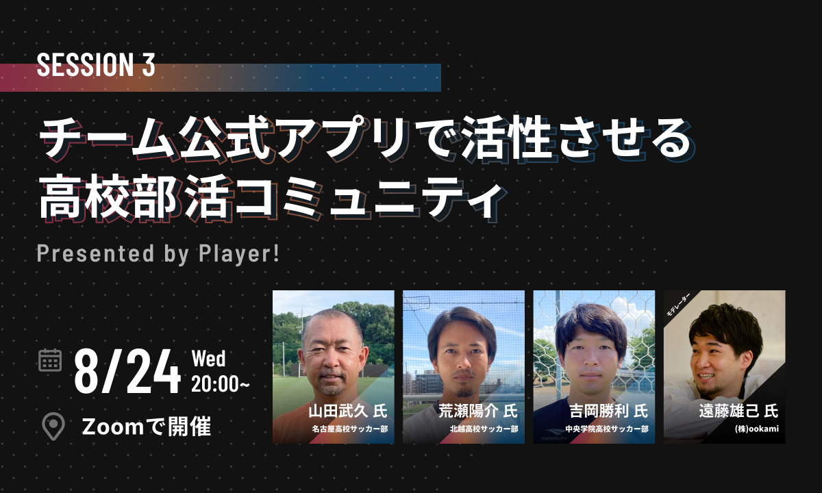 このセッションでは、Player! WHITEを導入し、チームでの活動に力を入れている高校部活動の3チームにご登壇いただき、「チーム公式アプリで活性させる高校部活コミュニティ」をテーマに、これからの高校部活コミュニティについてディスカッションをしていきます。OBOG会や保護者会を活性化させたい、部活動運営のデジタル化を進めたい、という方にオススメのセッションです!