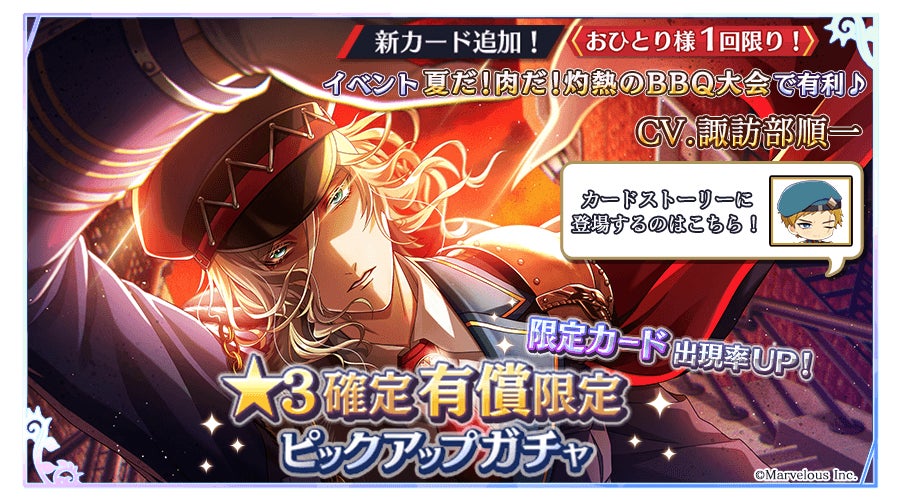 株式会社マーベラス(代表取締役社長:佐藤 澄宣/所在地:東京都品川区)による、スマートフォンゲーム『千銃士:Rhodoknight』(読み:せんじゅうし ろーどないと 以降、『千銃士R』)は、本日よりストーリーイベント「夏だ!肉だ!灼熱のBBQ大会」を開催いたします。本イベントではイベント限定ストーリーが読める他、プロローグ読了で★2「【ザクロ寮】十手(CV:田所陽向)」が手に入ります。イベントにあわせて、イベント内で活躍する★3「エルメ(CV:諏訪部順一)」の新カードがピックアップで登場する期間限定ガチャを開催いたします。