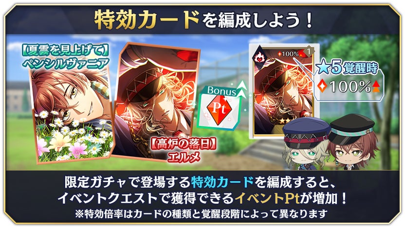 クエストで獲得できるイベントPt(ポイント)が増加したり、エリートクエストで効果を発揮する「イベント特効カード」で有利にイベントを進めましょう♪レアリティやカードによって発生する特効や特効の倍率が異なりますので、詳しくはゲーム内イベントクエスト画面内の「攻略のヒント」をご確認ください。