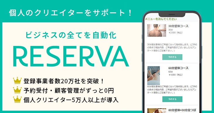 RESERVAは、美容・理容・ヨガ・フィットネス・音楽・料理・キャリア・育児・占いなど350業種以上の個人商圏を最大化する支援を行っています。