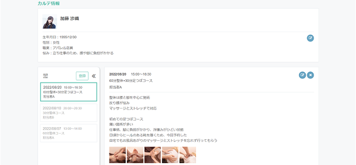 RESERVAのカルテ機能は、患者の通院履歴や症状に関する特記事項、患者に合う指圧やマッサージの手技療法など、整体師のメモを記録できます。顧客情報の詳細画面では、過去の施術履歴が一覧で表示されるため、担当する整体師は、患者の悩みや回復状況、姿勢の変化、よく痛みが生じる場所などをかんたんに把握することができます。また、仕事や趣味に関する内容も記録することで、施術内容の調整や次回来店時の会話に役立ちます。
