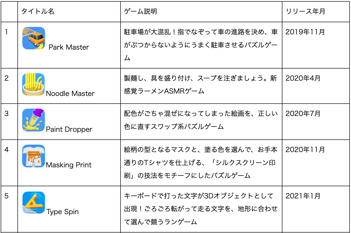 1作品目の「Park Master」は指で線を描いて車を駐車させるパズルゲームで、2019年12月に日本でも配信を開始後、米国および日本の両国で無料ダウンロードランキング1位を獲得いたしました(2020年1月27日時点)。その後もタイトルを順次配信し、2021年にはSensor Towerが発表している世界のアプリダウンロード数ランキングにおいて、アプリダウンロード数年間ランキングの日本企業1位を獲得。さらに同年同社が主催するアワード「Sensor Tower APAC Awards 2021」の“ベスト・ジャパニーズハイパーカジュアルパブリッシャ賞”を受賞いたしました。
