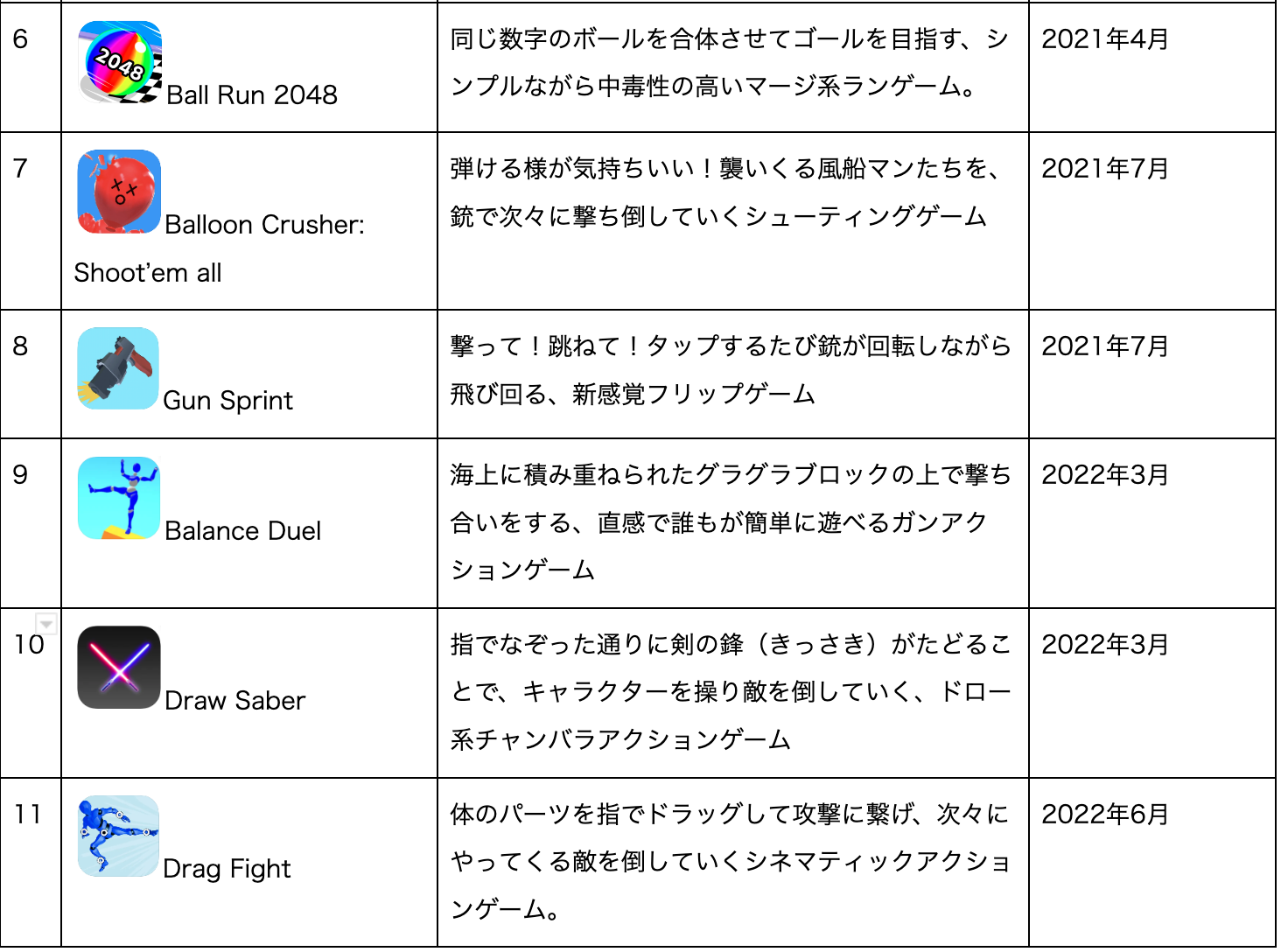 2022年4月に配信開始した10作品目のアクションゲーム「Draw Saber」もGoogle Play US版の無料ゲームランキングで1位を獲得し(2022年4月10日時点)するなど、快挙が続いていました。配信開始1年では、3作品で1億ダウンロードを達成、そしてこの度3年経たずに11作品で5億ダウンロードを突破しました。