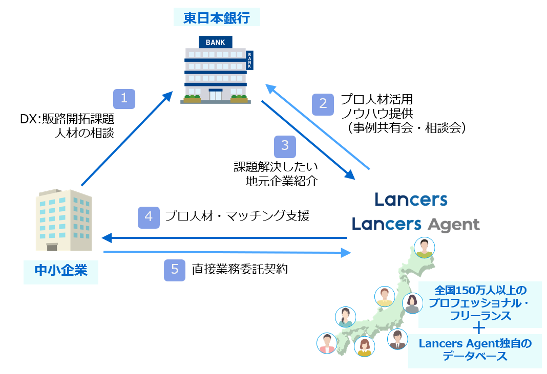 本業務提携により以下の取り組みを実施し、フリーランスマッチングプラットフォーム『Lancers』と、ハイスキルなITフリーランスを紹介する 『Lancers Agent』を通して、東日本銀行が支援する首都圏エリアの中小企業や個人事業主の経営課題解決を推進してまいります。