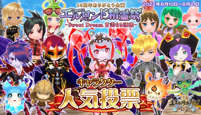 サービス開始14周年を記念しまして、『エレメンタルナイツR』のキャラクター人気投票を実施させていただきます。投票いただいた方の中から抽選で14名様に、プレゼントがあるかも!