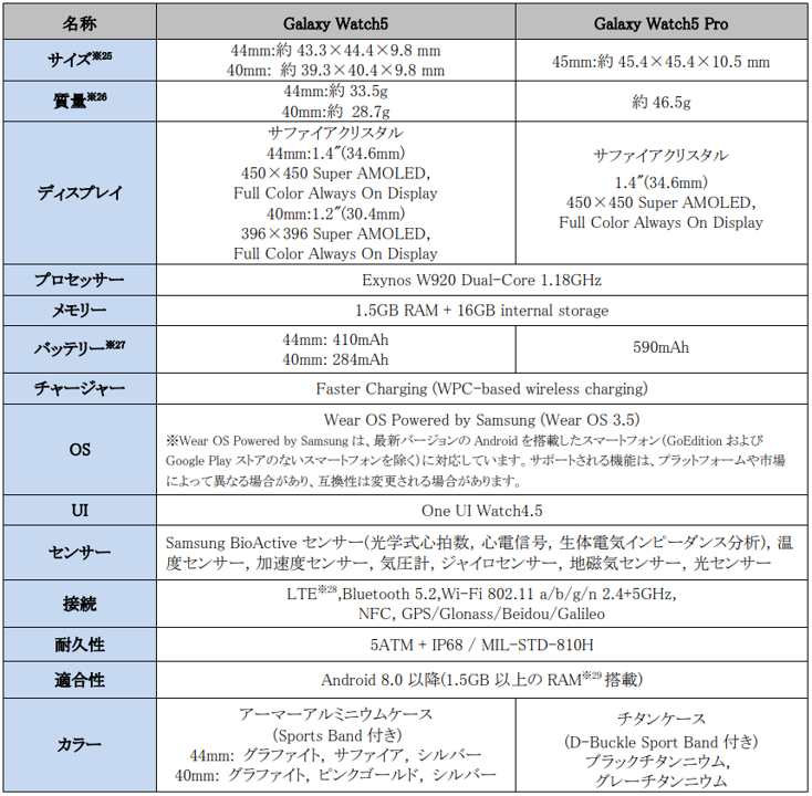 <「Galaxy Watch5」/「Galaxy Watch5 Pro」の主な仕様>※23※24