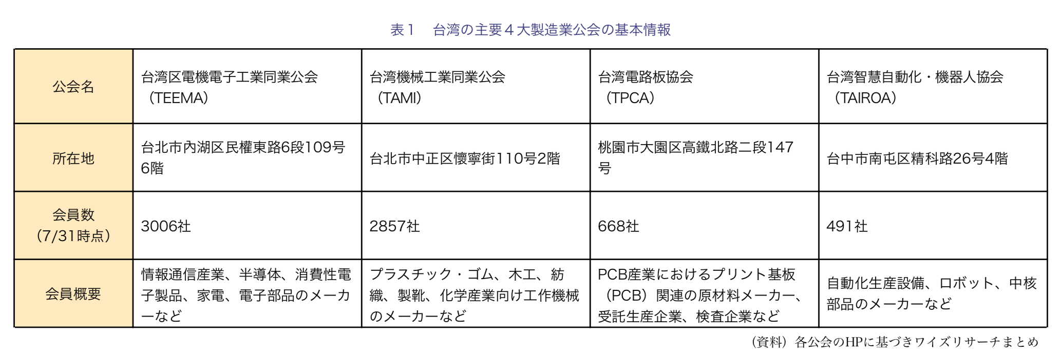 台湾区電機電子工業同業公会(電電公会、TEEMA)は情報通信産業、半導体、消費性電子製品、家電、電子部品のメーカーを含む3000社余りの会員企業があり、電電公会は会員企業だけで2021年の台湾の輸出総額の60%、生産額の57%を占めるなど台湾で最も重要な同業者組合となっている。(中略)