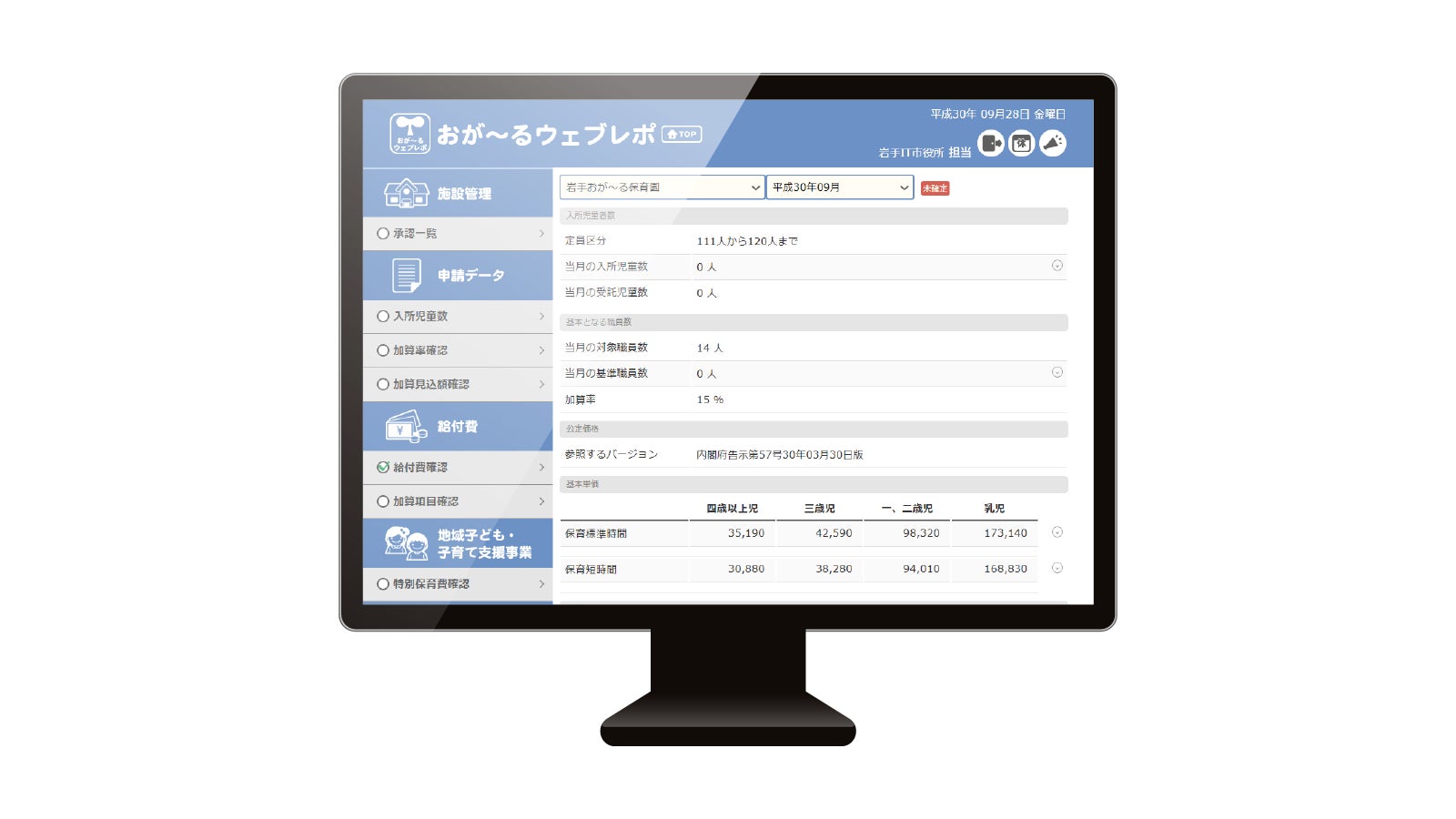 「おが~るウェブレポ」は、毎月自治体様と保育所等施設様の間で行われている給付費等の算定・申請をウェブ上で行えるシステムです。