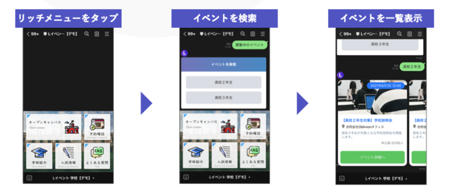 LINE公式アカウントのトーク上でイベント(オープンキャンパスや説明会など)の検索から参加申し込みまでカンタンにできます。気軽にLINEで事前予約ができるため、三密を避けたイベント運営も可能です。