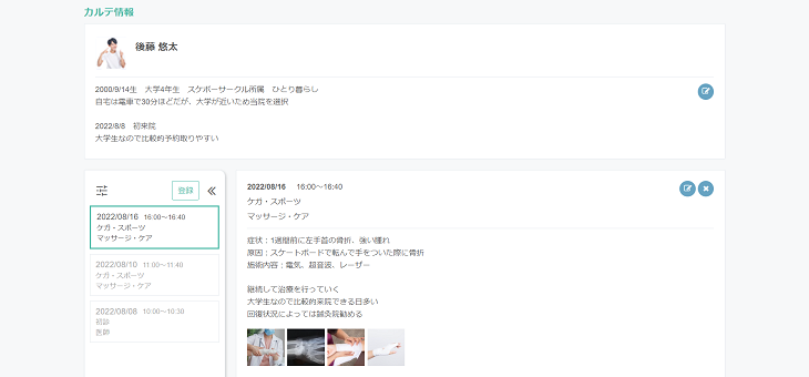 RESERVAのカルテ機能は、患者の通院履歴や症状に関する特記事項、患者が希望した施術法など、柔道整復師のメモを記録できます。顧客情報の詳細画面では、過去の施術履歴が一覧で表示されるため、担当する柔道整復師は、負傷した部位とその原因・時期、骨折や脱臼、捻挫、打撲、挫傷の回復経過などをかんたんに把握することができます。また、患者との会話で得た要望を記録しておくと、次回施術時に役立てることもできます。