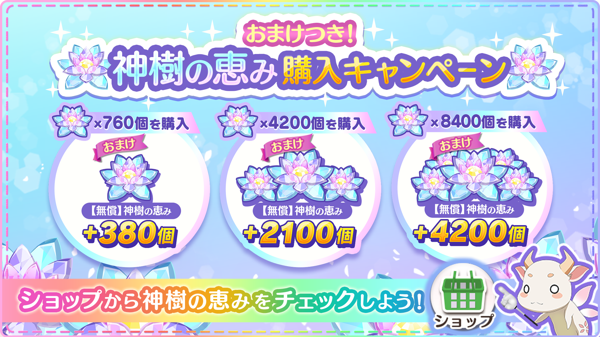 期間中、ショップに「神樹の恵み(無償)」のおまけつき「神樹の恵み(有償)」のアイテムが追加されます。
