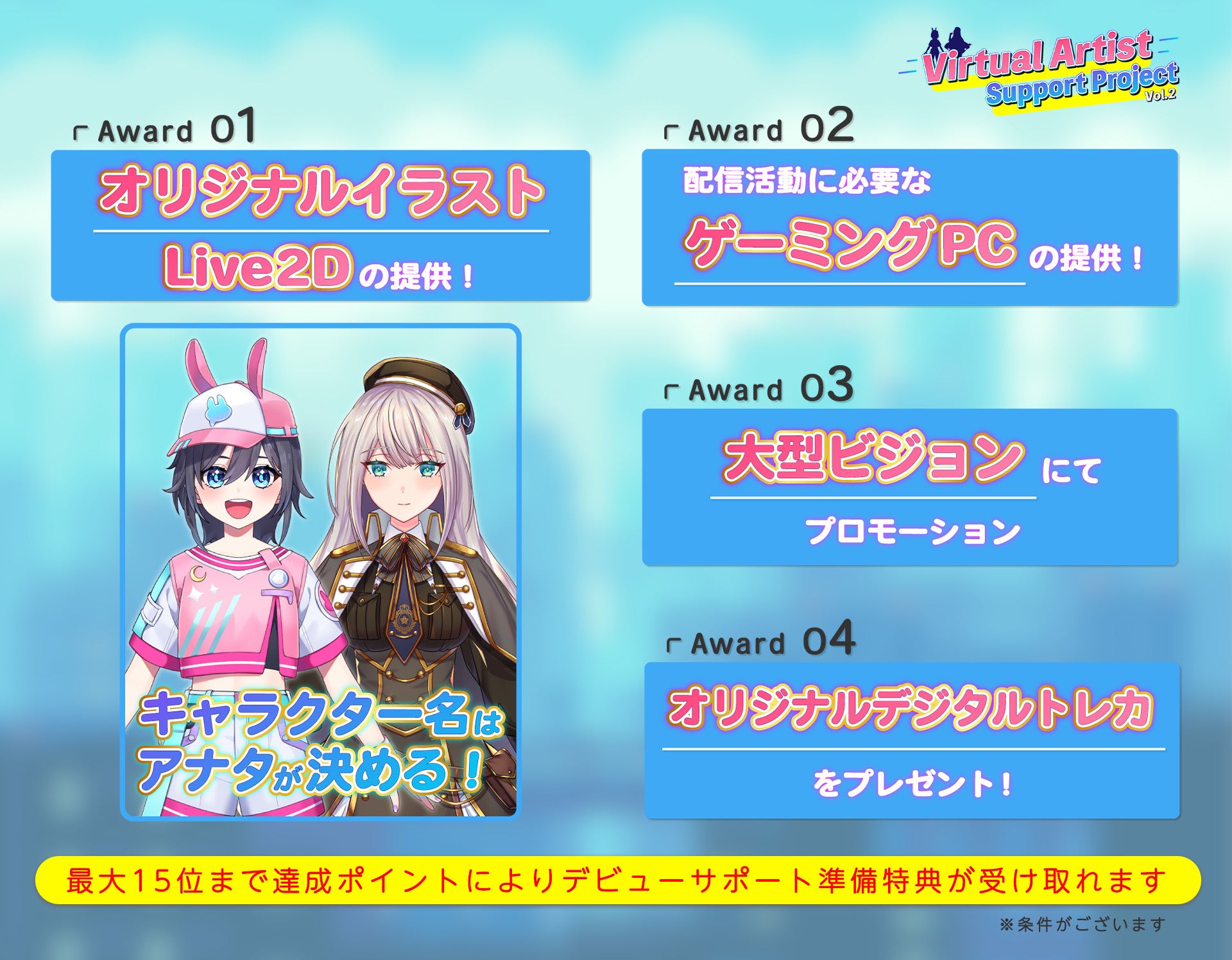 合格者2名には、イラスト・Live2D・ゲーミングPCなど、今後バーチャルで活動していくために必要なセットをフルサポートいたします。