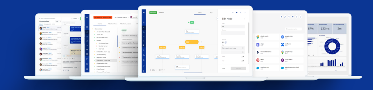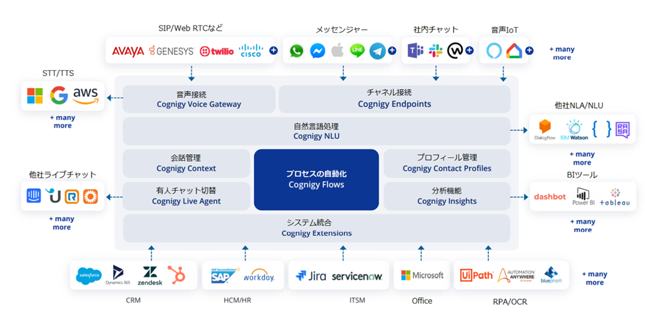 Cognigyは、2022年春に対話型AIプラットフォームのジャンルにて、ガートナー社よりグローバルでLeaderポジションに選定されました。直感的なエディター機能により、短期間で拡張性の高い対話型AIをノーコード・ローコードでの設計・開発が可能で、標準でSalesforce、zendesk、UiPathなどの様々な業務システムと連携可能なコネクターを多数サポートしており、自然な会話にて業務の自動化が実現できる対話型のAIボットをフレキシブルにデザイン・運用することができます。