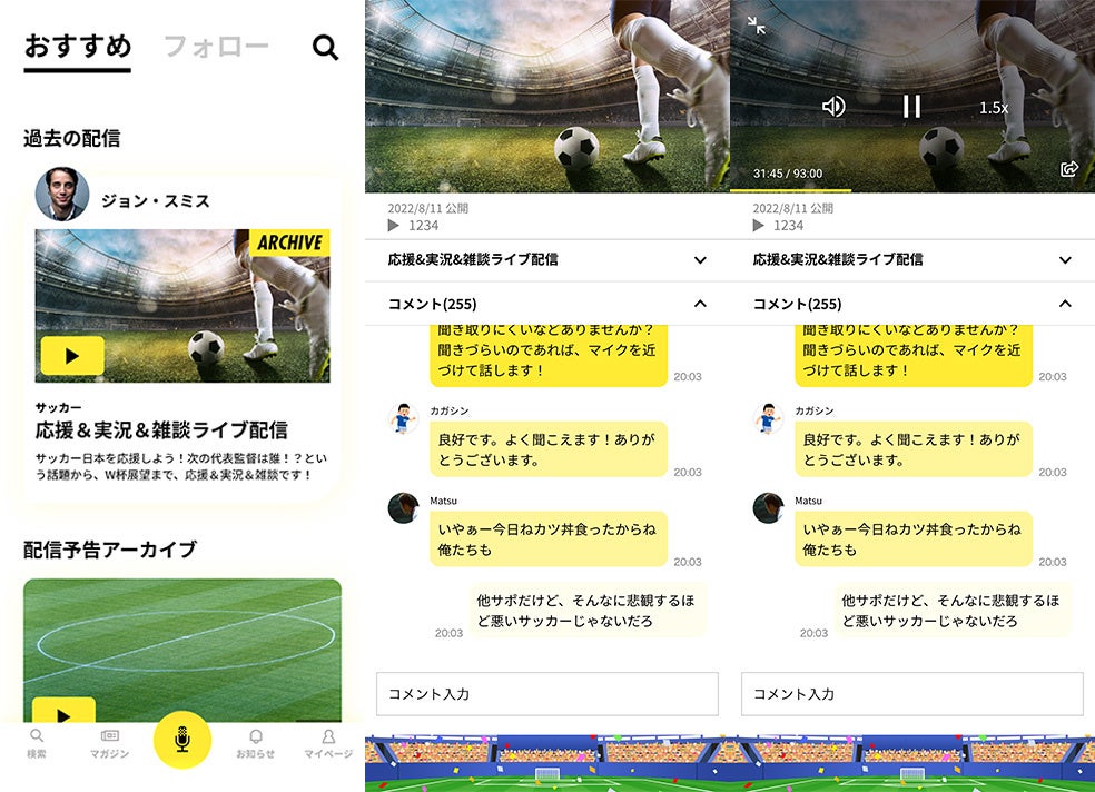 「I T」×「スポーツ」×「音声」でスポーツ観戦の新しいカタチを創出する実況観戦アプリです。会場で見るだけだったスポーツに実況・解説をつける事でよりスポーツを理解でき、チャット機能を使い更に一体感の生まれる観戦体験を提供します。