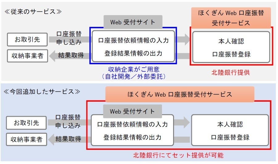・これまでは、収納事業者にて①自社開発、または②外部ソフトウェア会社への委託によりご用意いただいておりました。今回の見直しにより、当行にて③Web口座振替とセットでの提供(HCSと連携)が可能となり、3つの方法からお選びいただけます。