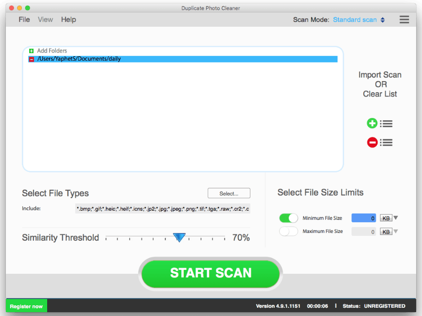 対応OSはmacOS 10.6以降のDuplicate Photo Cleanerはシンプルな操作画面を備える重複写真と類似画像の検索ソフトです。頻繁に使用されるほぼ全ての画像フォーマットをサポートしており、類似度を変更して類似写真の検索をかけられるので広い範囲での写真検索が可能です。