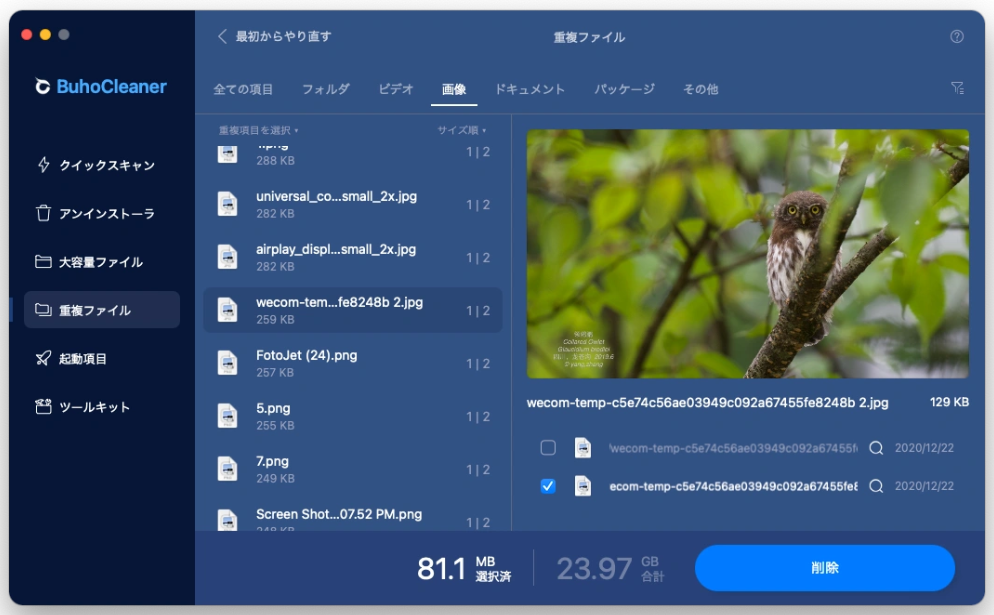 macOS 10.2以降での利用が推奨されるBuhoCleanerはMacの各フォルダを検索して重複した写真を検出できるソフトです。曲、ドキュメント、ビデオなどの重複にも対応、要らないファイルを削除するクリーナー機能、不要なアプリのアンインストール、大容量ファイルを検出する機能などを有します。