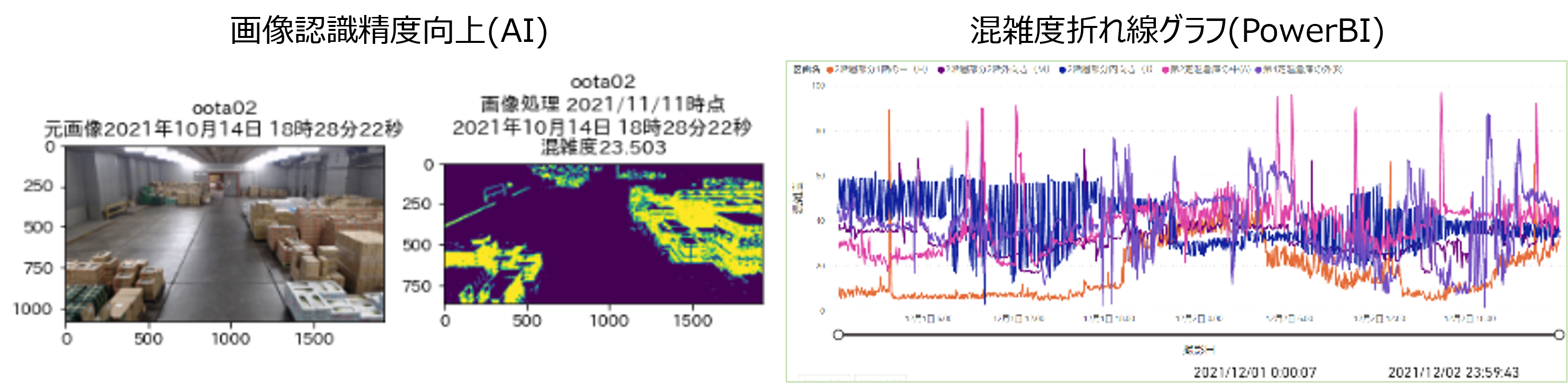 上記の問題解決を目指して、全体最適の視点から現状の運用と課題を把握し施策を講じるために、商品配置およびフォークリフト・ターレ動線について、カメラ画像によるAI動態分析を行ったうえで、それらの最適化に向けた施策の検討・検証を実施しました。