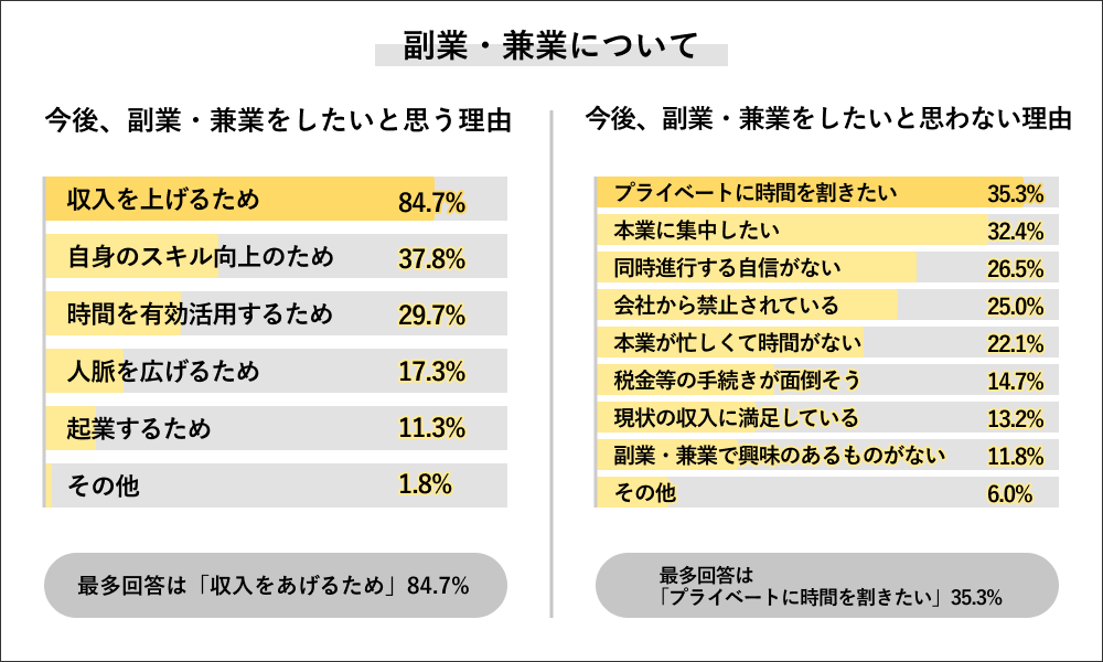 “したい派”を回答した595人にその理由を聞くと、「収入を上げるため」84.7%が最多回答になり、次いで「自身のスキルを向上させるため」が37.8%、「時間を有効活用するため」が29.7%で上位3つの結果になりました。更に”したくない派”の理由は「プライベートに時間を割きたいから」が35.3%で最多になり、次いで「本業に集中したい」が32.4%、「同時進行する自信がない」が26.5%で上位3つの回答結果になりました。