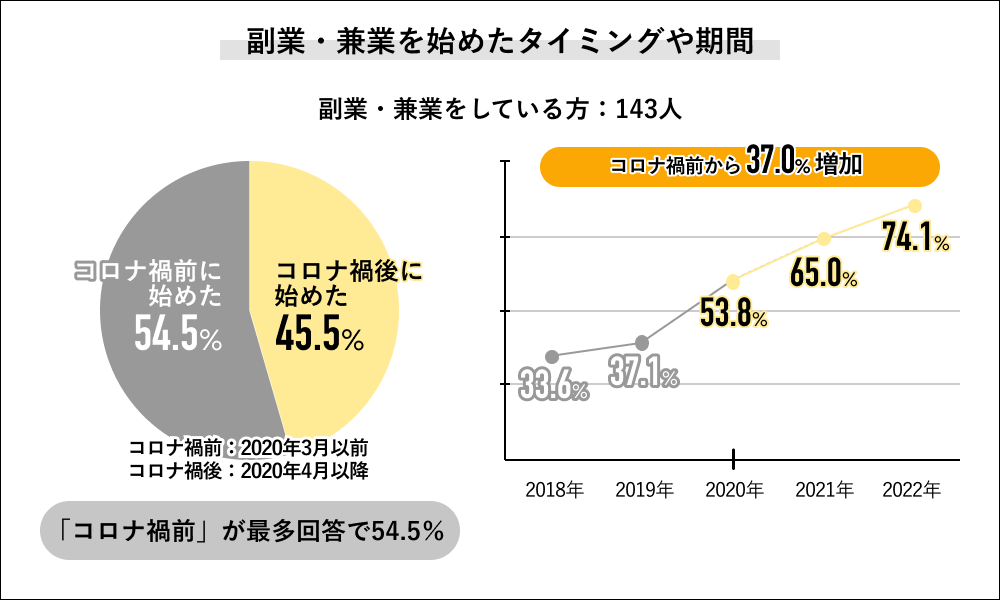副業・兼業を始めたタイミングについては全体の45.5%が「コロナ禍後」と回答し、54.5%が「コロナ禍前」の結果になりました。また副業・兼業を始めた時期を見ると、コロナ禍前の2019年までは37.1%に対し、コロナ禍に入った2020年に急増し、そこから毎年約10%増の推移で2022年は74.1%と、コロナ禍に入ってから副業・兼業を開始した回答者が多いことがわかりました。