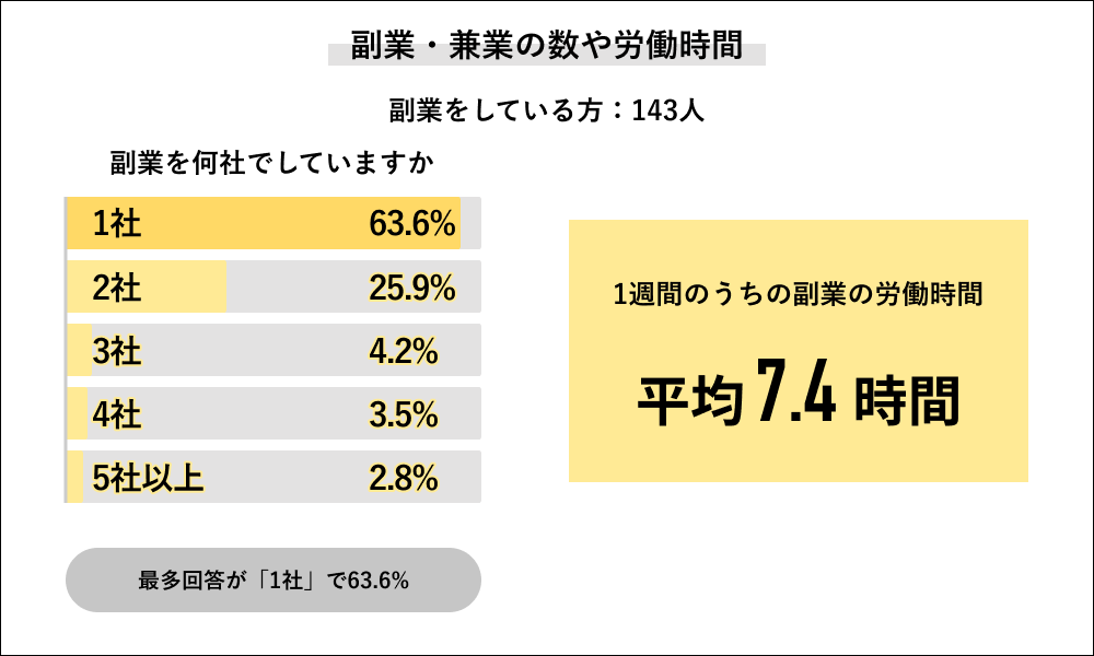 副業・兼業をしていると回答した143人に本業以外で仕事をしている社数を聞くと、「1社」が63.6%で最多回答になり、「2社」が25.9%、「3社」が4.2%と続き、最も少ないのは「5社以上」2.8%の回答結果になりました。また副業・兼業に割く労働時間では全体平均で7.4時間でした。