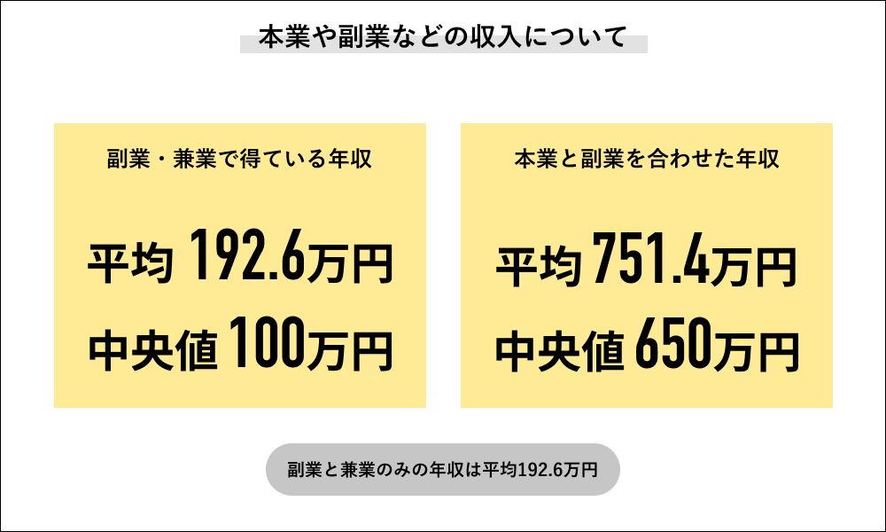 また、本業と合算した年収の平均は「751.4万円」、中央値は「650万円」の回答結果になりました。
