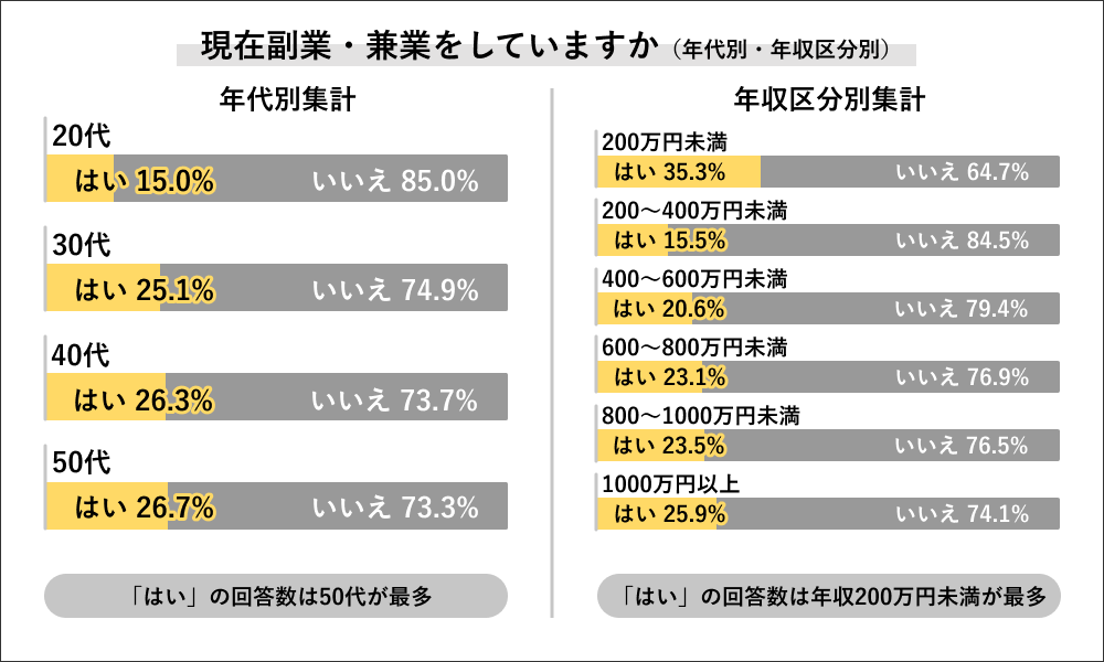 また「副業・兼業をしている」の回答を”年代別”で見ると、50代が26.7%で最多になり、最も少ないのは20代の15.0%でした。更に同じく「副業・兼業をしている」の回答を”本業だけの年収区分”で見ると「200万円未満」が35.3%で最多になり、次いで「1,000万円以上」が25.9%、「800〜1,000万円未満」が23.5%で上位3つの回答になりました。