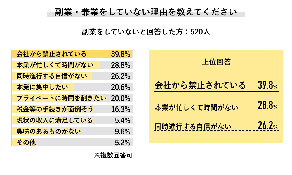 一方副業・兼業をしていないと回答した520人にその理由を聞くと、「会社から禁止されているから」が39.8%で最多回答になり、次いで「本業が忙しくて時間がない」が28.8%、「同時進行する自信がない」が26.2%で上位3つの回答になりました。
