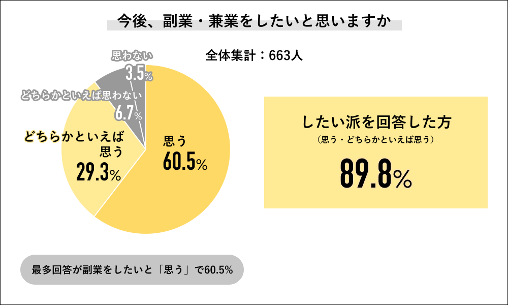 今後副業・兼業をしたいか否かについて聞くと、「したいと思う」60.5%と「どちらかといえばしたいと思う」29.3%を合算した89.8%が”したい派”の回答をしました。”したくない派”は10.2%でした。