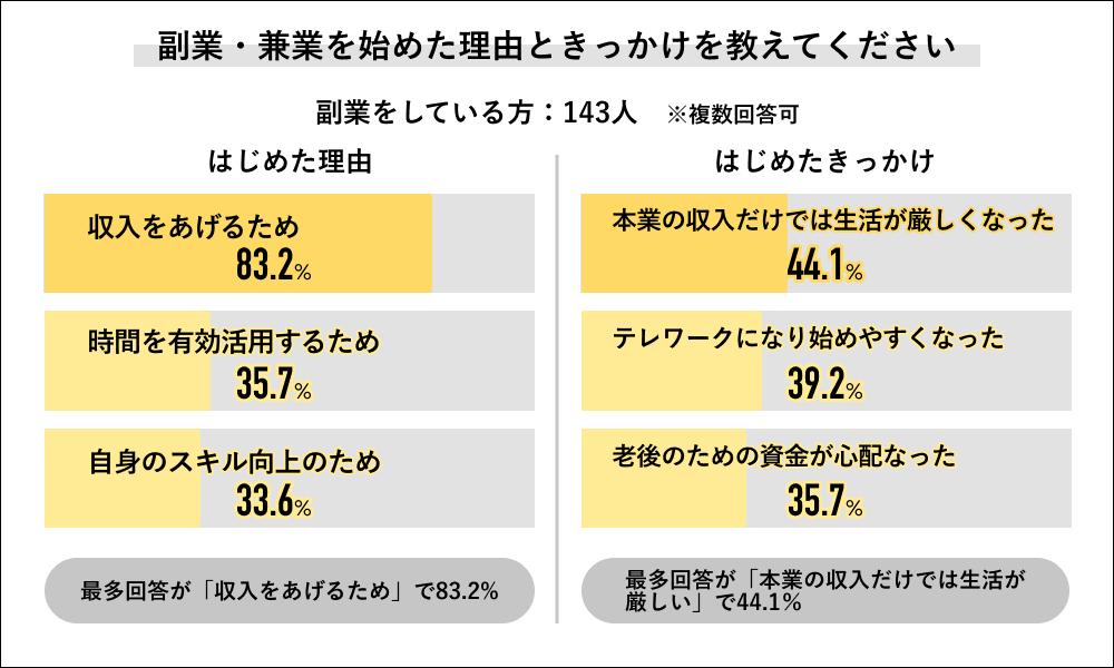 副業・兼業をしていると回答した143名の”始めた理由”で最も多かったのは、「収入を上げるため」で83.2%、次いで「時間を有効活用するため」が35.7%、「自身のスキルを向上させるため」が33.6%で上位3つの回答になりました。また”始めたきっかけ”については「本業だけでは生活が苦しくなった」が44.1%で最多回答になりました。