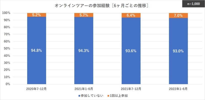 ● 2020年7-12月と比較して、2022年1-6月の「オンラインツアー参加経験」割合は、1.8ポイントの上昇にとどまる。