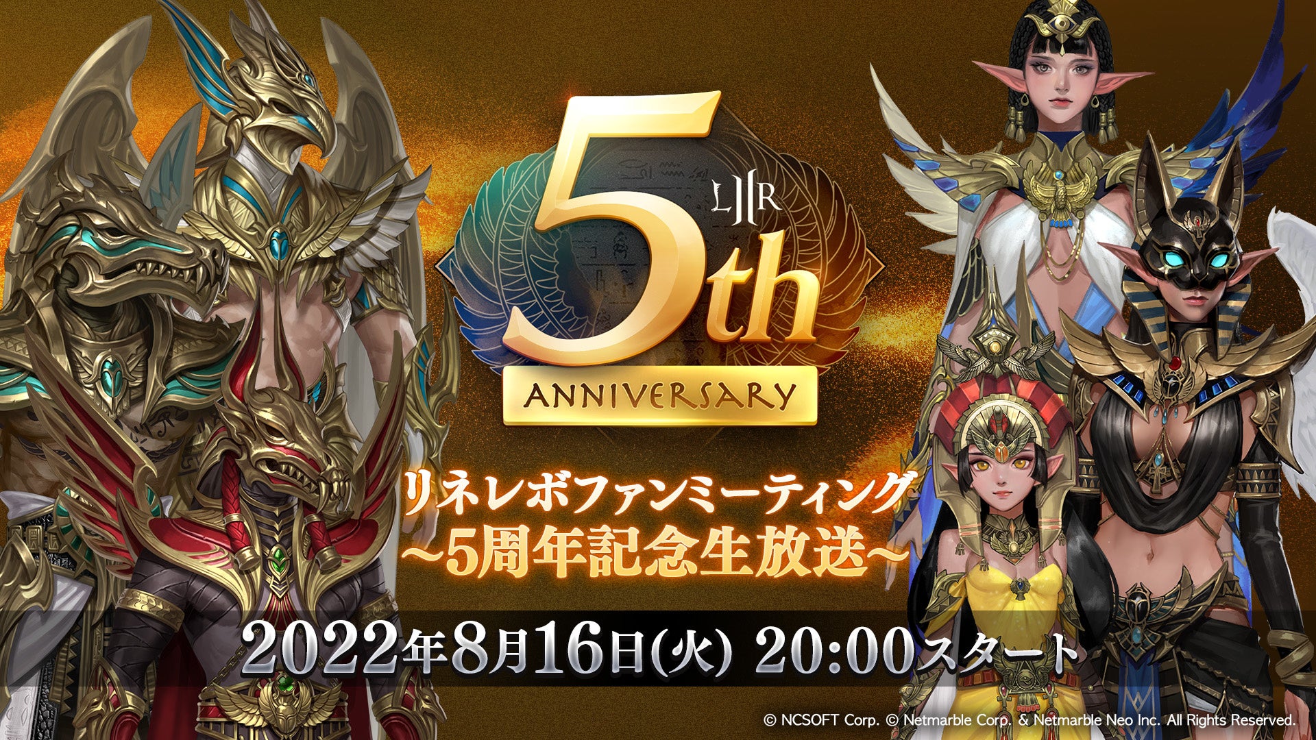 サービス5周年を記念して、日頃よりご愛顧いただいているプレイヤーの皆様への感謝を込めた特別番組「リネレボファンミーティング ~5周年記念生放送~」を、明日8月16日(火)の20時よりYouTube Liveにて生配信いたします。