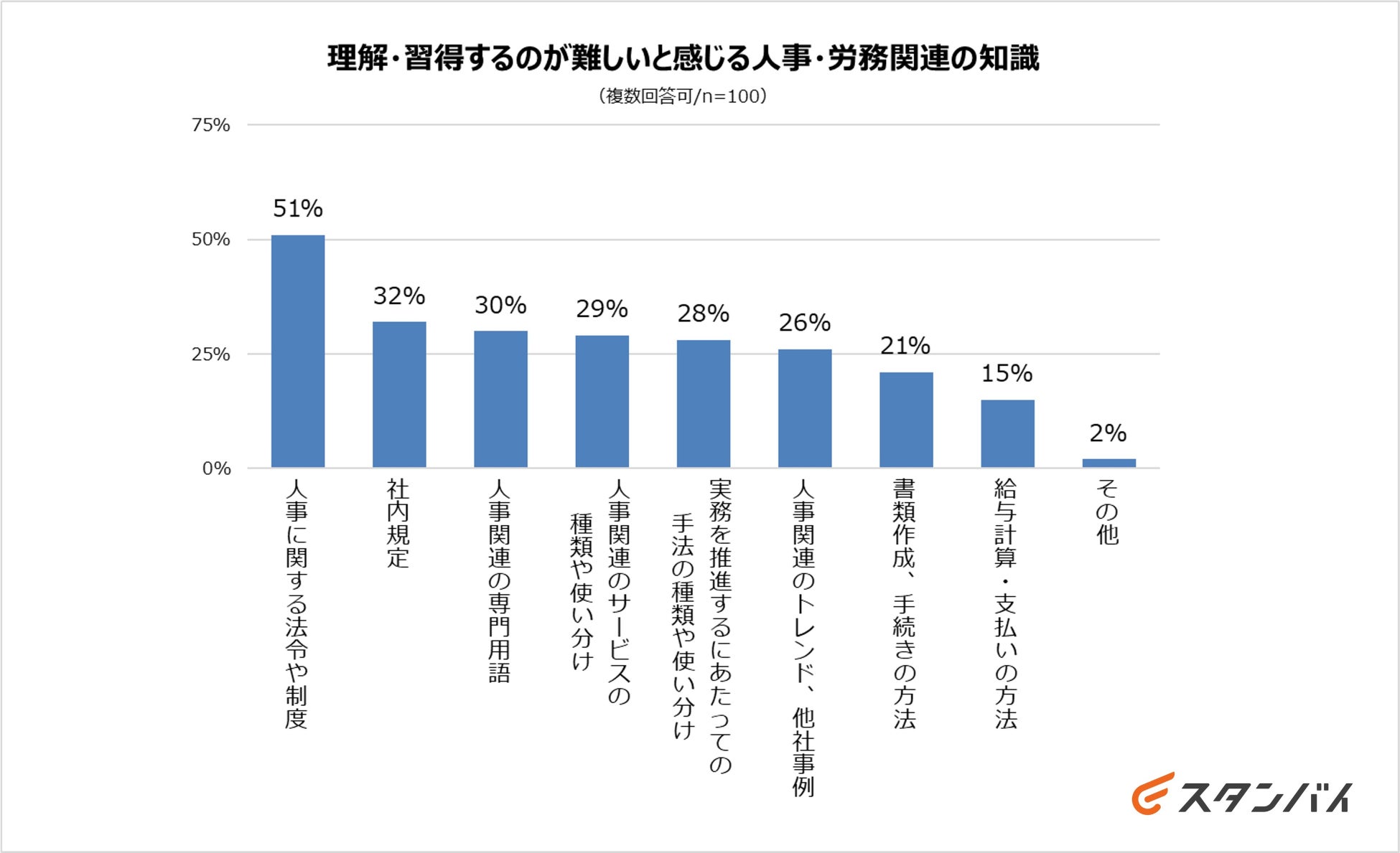 人事担当者に業務の中で難しいと感じることを聞いたところ、4割以上の方が「人事・労務関連の知識労務関連の知識習得」が難しいと感じていることがわかりました。特に、「人事に関する法令や制度」においてはアップデートもあるため、最新の情報を正しく理解をするのが難しいと過半数の方が感じています。
