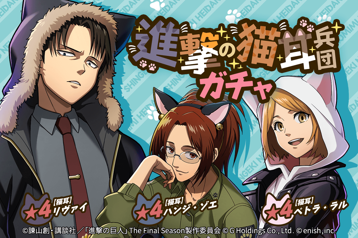 ・新登場の【猫耳】リヴァイ/【猫耳】ペトラ・ラル/【猫耳】ハンジ・ゾエ」がピックアップされたガチャ。